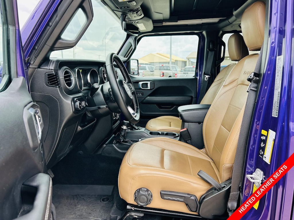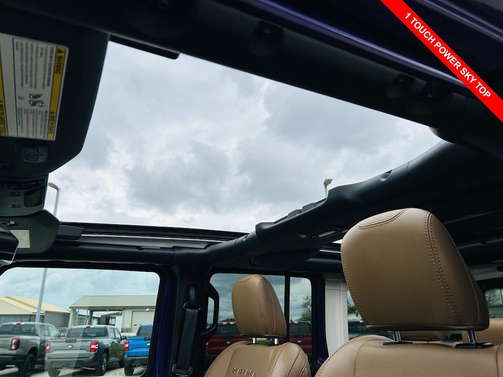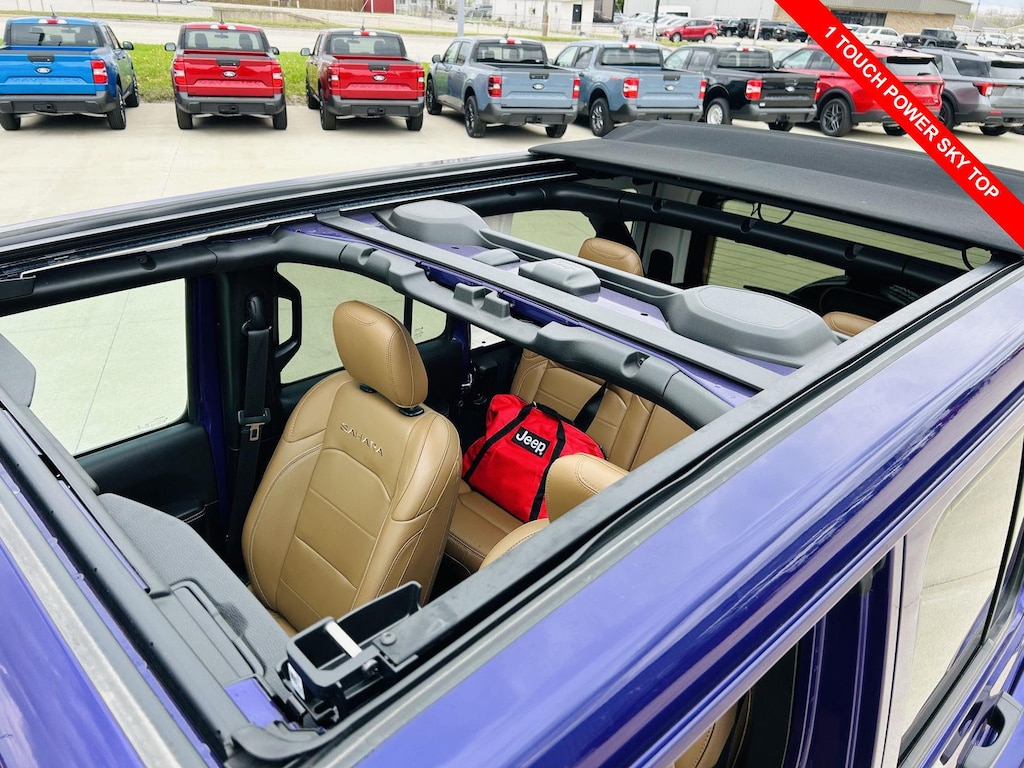 Step inside and experience a blend of rugged capability and modern comfort. The Leather front seat upholstery in Dark Saddle/Black provides a premium feel, while the Heated front seats and Heated steering wheel offer warmth on chilly mornings. The Sky 1-Touch Power Top lets you quickly open up the cabin to the elements. The Dual-zone front climate control ensures both driver and passenger stay comfortable. The vehicle features 2 12V DC Power Outlets and 1 Interior 120V AC Power Outlet, providing ample power for your devices and accessories.