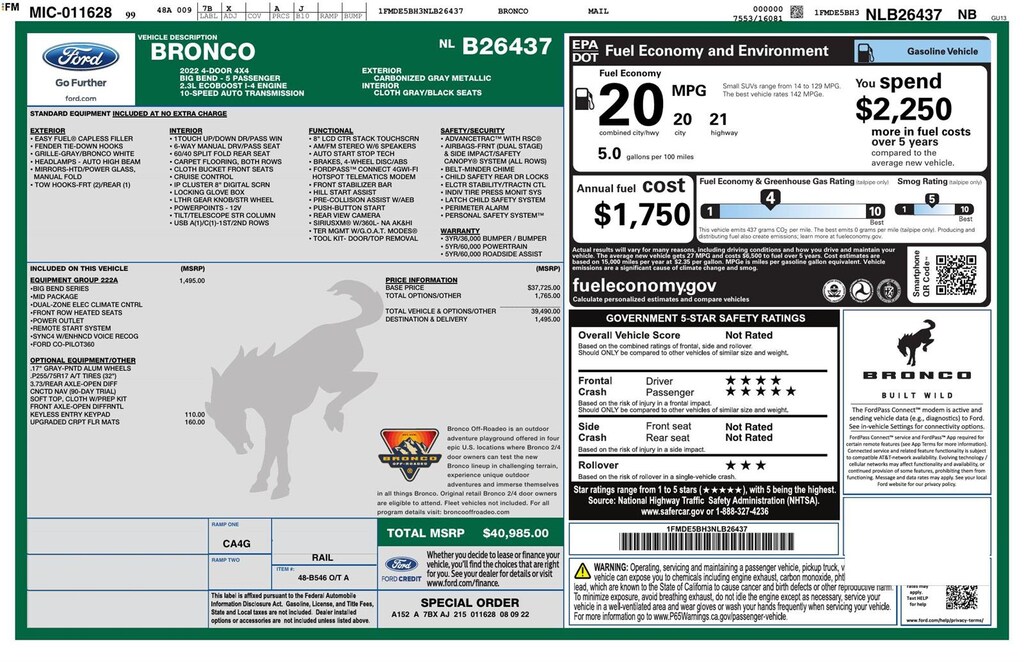 ENGINE: 2.3L ECOBOOST I-4, CARBONIZED GRAY METALLIC, DARK GRAY W/BLACK ONYX, CLOTH BUCKET SEATS