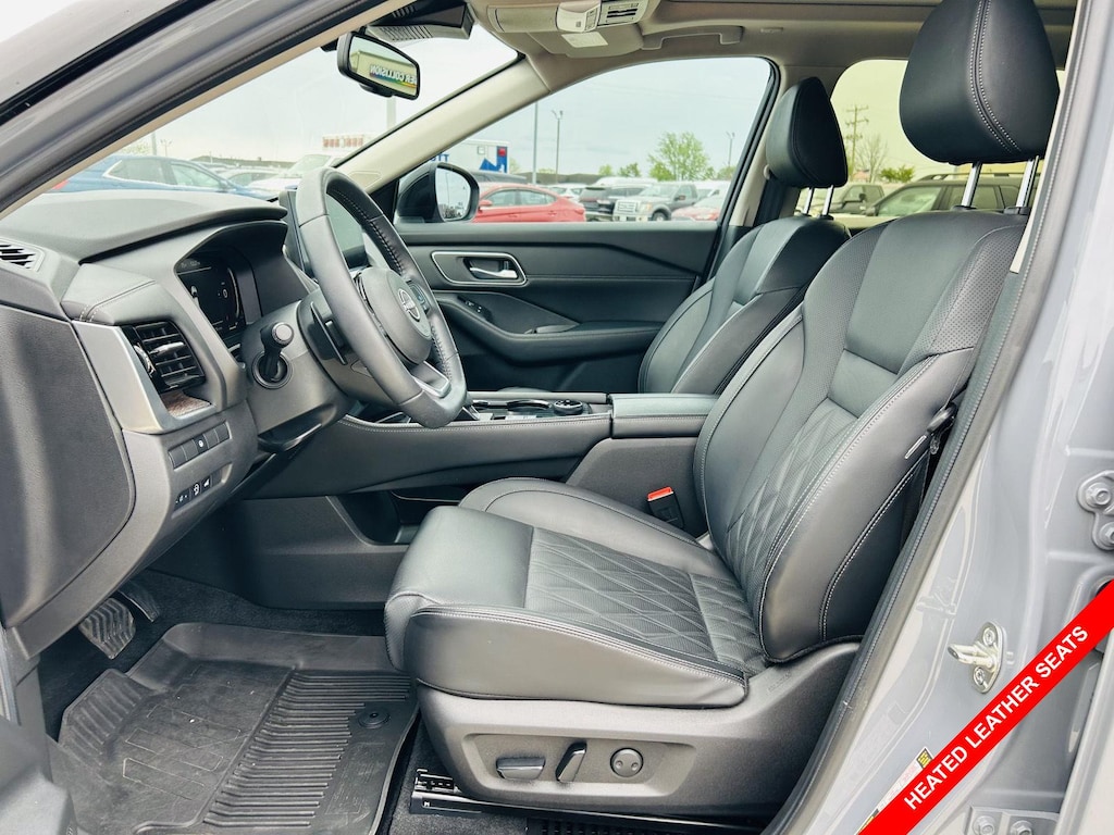 Step inside the 2024 Nissan Rogue Platinum and experience a world of comfort and refinement. The Semi-Aniline leather front seat upholstery provides a luxurious touch, while the Heated front seats keep you warm and cozy on chilly mornings. The Heated Leather Steering Wheel adds an extra layer of comfort, making every drive a pleasure. The Automatic climate control ensures a comfortable cabin temperature, and the Dual-zone front climate control allows you and your passenger to customize your individual comfort levels. The Express Open/Close Sliding And Tilting Glass 1st And 2nd Row Sunroof w/Power Sunshade brings the outdoors in, while the Power driver seat controls and Power passenger seat controls allow you to find the perfect seating position. The Floor Mats with 2-Piece Cargo Area Protector help keep your interior clean and protected.